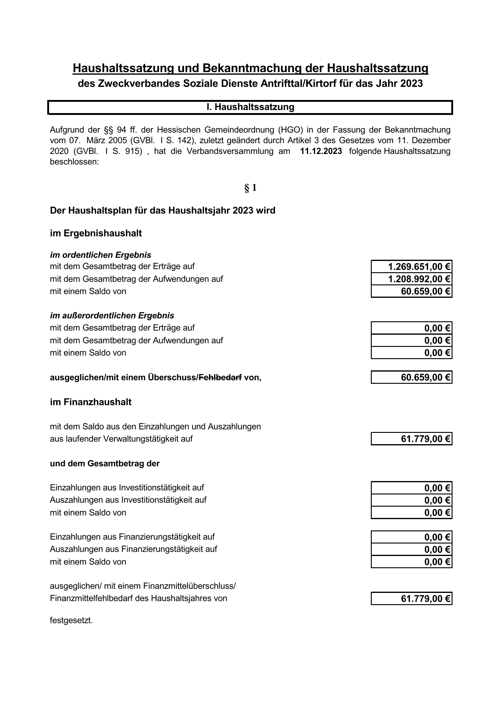 Haushaltssatzung und Bekanntmachung der Haushaltssatzung