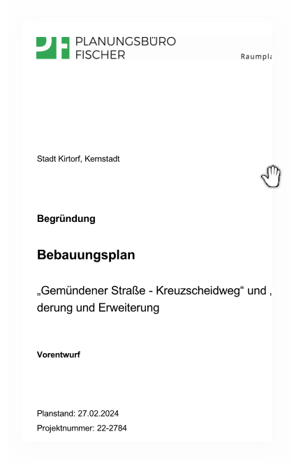 Es wird darauf hingewiesen, dass Stellungnahmen elektronisch übermittelt werden sollen, bei Bedarf aber auch auf anderem Weg, zum Beispiel schriftlich, in Textform oder zur Niederschrift, abgegeben werden können. Die elektronische Abgabe der Stellungnahmen ist zum Beispiel unter der E-Mail-Adresse beteiligung@fischer-plan.de möglich.